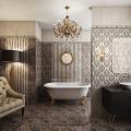 Подчеркнуто строгая и лаконичная коллекция «Генуя» в бежево-коричневых тонах с декорами в светлую полоску на темном камне – это демонстрация уверенности и достоинства. Очевидная красота дизайнерского решения – это декоры в виде витиеватого «обойного» рисунка.